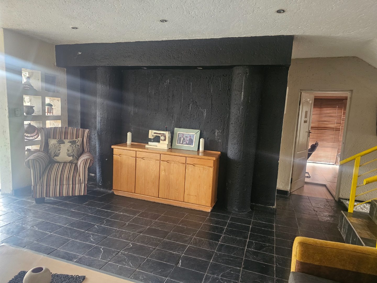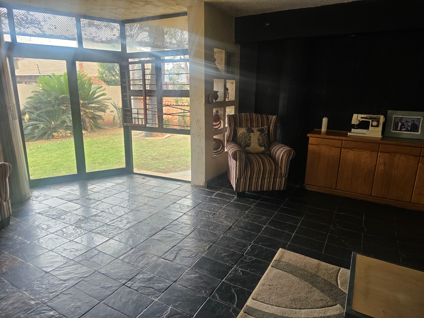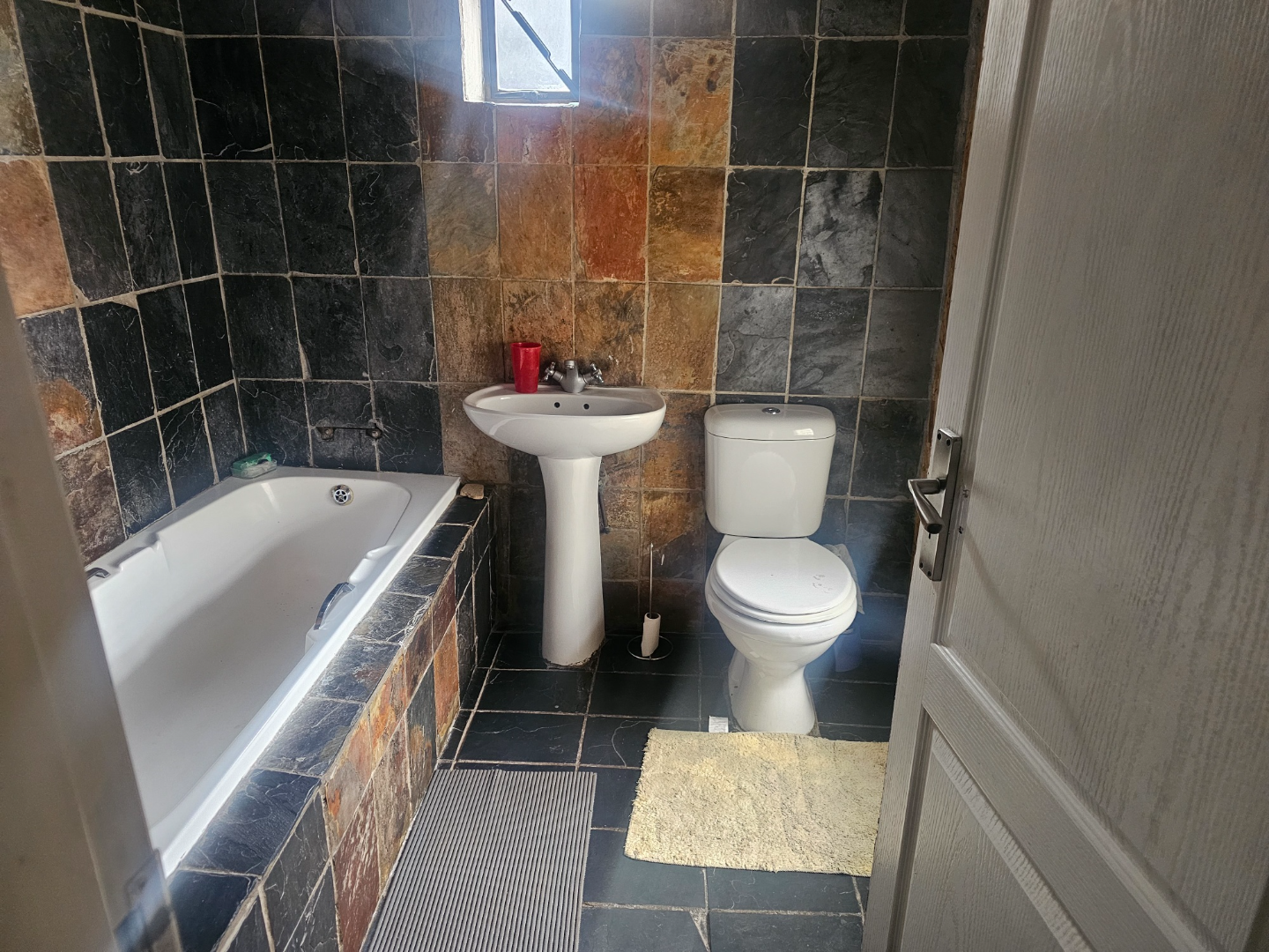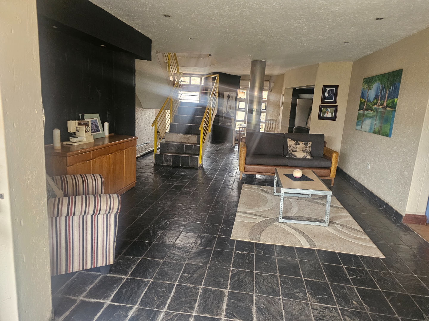 Discover this modern multi-story family home located in the vibrant community of Spruit View, Katlehong, South Africa. The property presents a distinctive architectural design with neutral-toned exteriors and prominent balconies, offering a welcoming first impression. Enhanced security is a key feature, with a high perimeter wall, electric fencing, and a robust, ornate entrance gate, complemented by a patterned stone driveway providing convenient off-street parking. Inside, the residence boasts four comfortable bedrooms and two well-appointed bathrooms, including a private en-suite for added convenience. The living spaces comprise two spacious lounges and a dedicated dining room, providing ample room for relaxation and entertaining. The modern kitchen is equipped with white and grey cabinetry, dark countertops, a gas stovetop, and a double sink, catering to contemporary living needs. Outdoor living is facilitated by a private backyard garden featuring a green lawn and mature plants, alongside a concrete patio area perfect for enjoying the South African climate. A utilitarian garage with a wooden sectional door and tiled flooring offers secure parking for one vehicle, with an additional parking space available. Spruit View offers a dynamic residential environment within Katlehong, providing residents with access to local amenities and a sense of community. This property combines modern living with practical security features, making it an ideal family residence. Key Features: * Modern Multi-Story Home * 4 Bedrooms, 2 Bathrooms (1 En-suite) * 2 Lounges, 1 Dining Room * Modern Kitchen with Gas Hob * Private Garden and Patio Area * Secure Parking: 1 Garage, 1 Parking * Electric Fencing & Access Gate * Paved Driveway