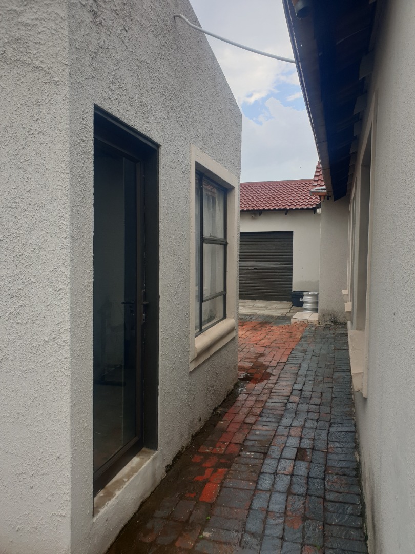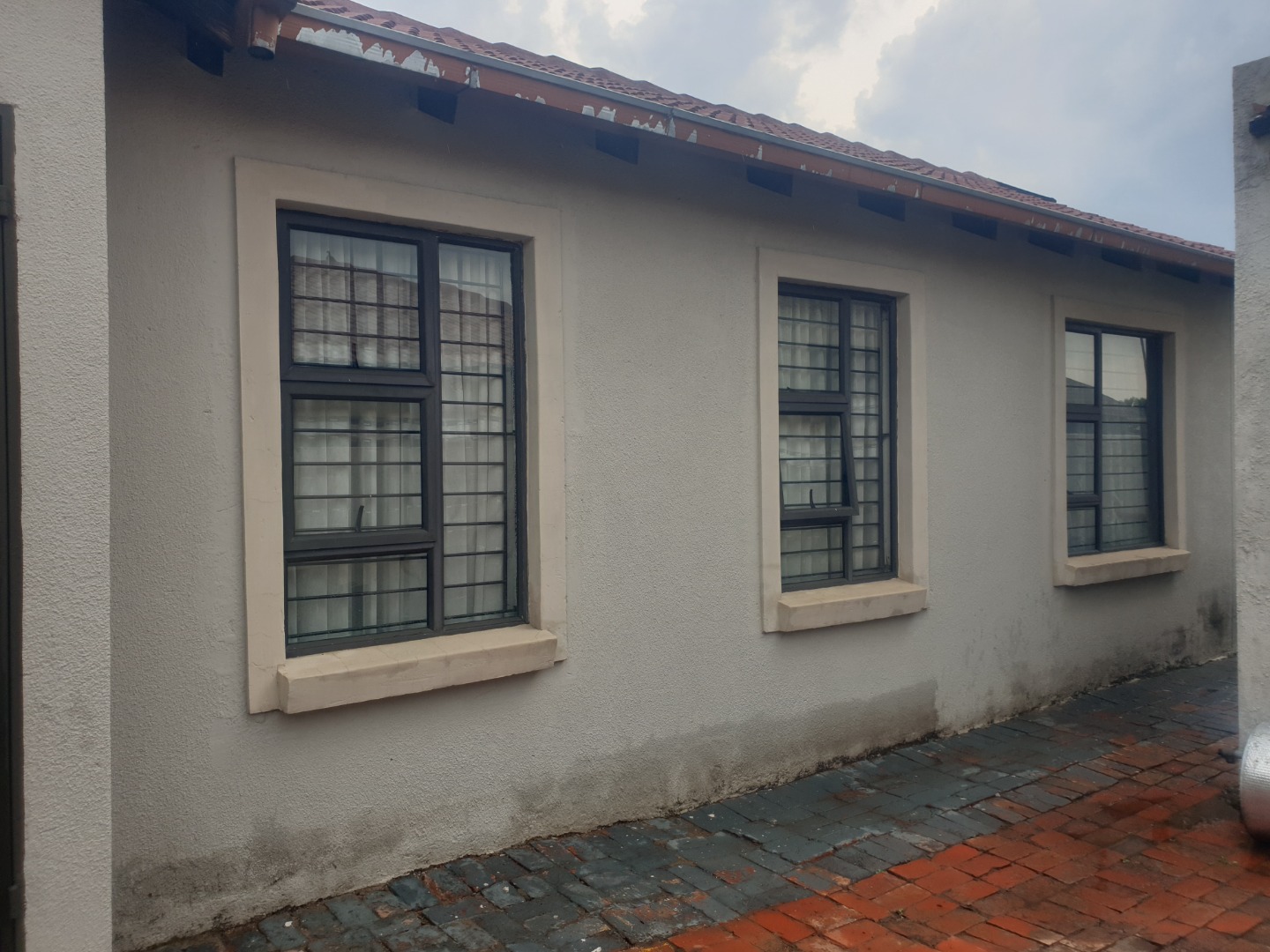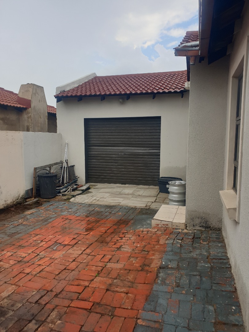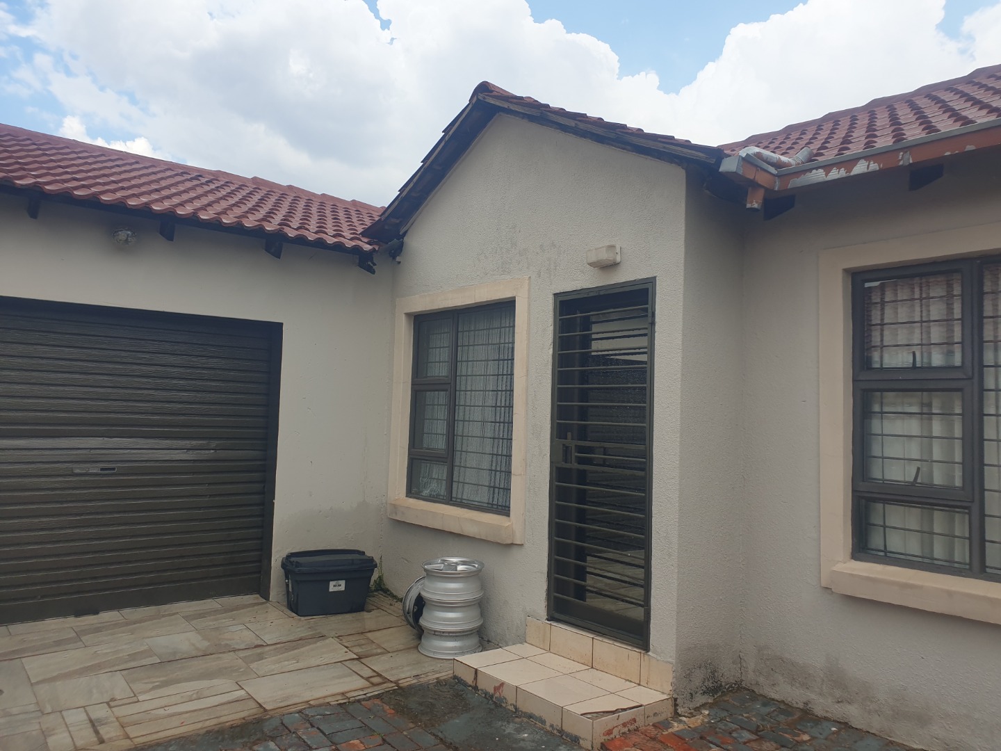 This single-story residential property in Leondale, Germiston, offers practical suburban living. The home presents a neat exterior with light-colored walls and a red tiled roof, complemented by a red brick paved driveway leading to a double garage. The well-kept facade provides a welcoming first impression.