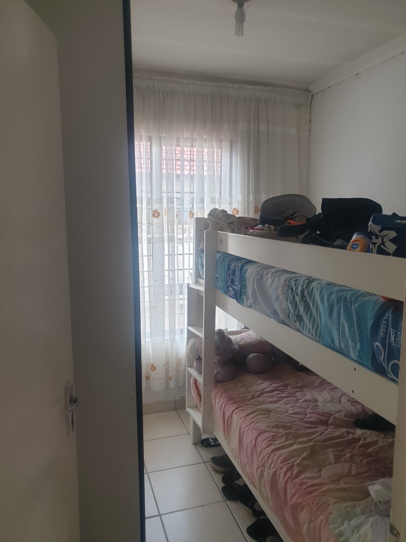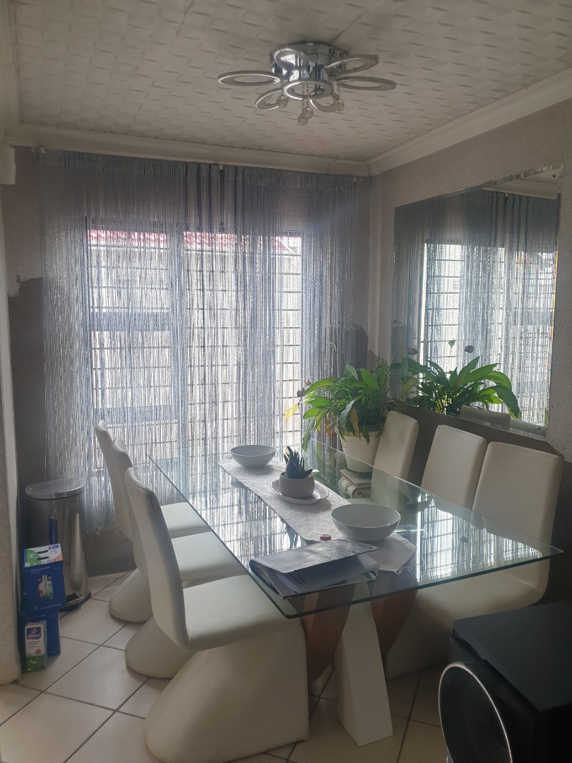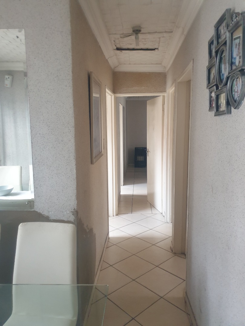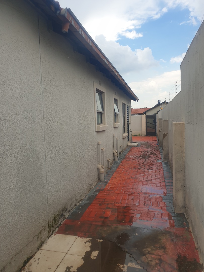 This single-story residential property in Leondale, Germiston, offers practical suburban living. The home presents a neat exterior with light-colored walls and a red tiled roof, complemented by a red brick paved driveway leading to a double garage. The well-kept facade provides a welcoming first impression.