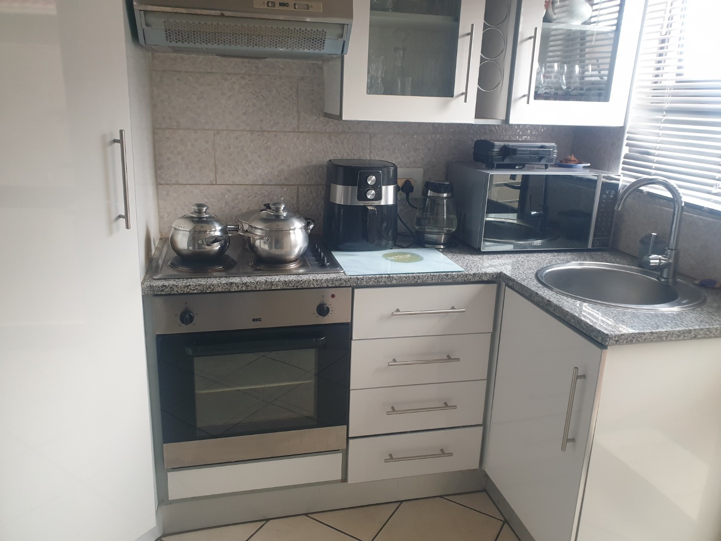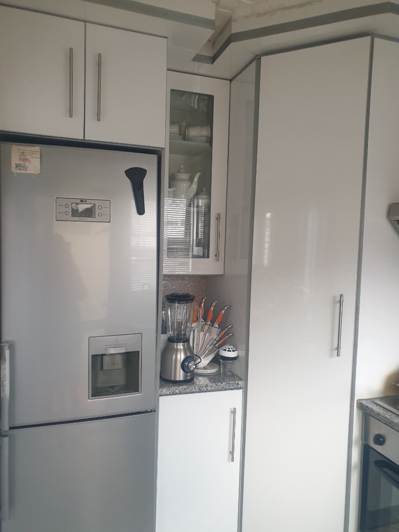 The kitchen boasts modern white high-gloss cabinetry and granite-look countertops, offering a sleek aesthetic. It includes an integrated oven, a two-plate hob, and a stainless steel refrigerator. While compact, it provides ample storage with overhead cupboards and drawers, catering to daily culinary needs.